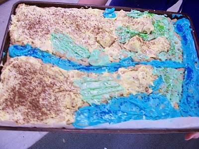 You may notice the Nile Delta is missing, so it must be the dry season. Actually, she just thought it would melt. This map is gluten free, to be eaten by her brother and youngest sister. The dessert sands are yellow frosting sprinkled with cocoa powder. Green frosting represents the Black lands, fertile areas. We actually made the cookie dough and baked it on Saturday, then decorated it during school on Monday. And we had a neighbor helping with the dictionary to look up some of the geography terms for the imaginary land.